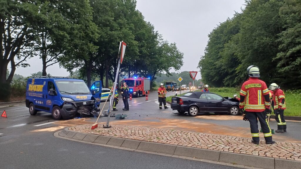 (fba) Thieshope. Die Freiwilligen Feuerwehren aus Thieshope und Brackel mussten am Freitagmorgen zu einem Verkehrsunfall auf der L215 zwischen Thieshope und Brackel ausrücken. Auf Höhe der BAB Anschlussstelle Richtung Hamburg kollidierten gegen 6:30 Uhr ein Fiat Ducato und ein Opel Cabriolet. Die Feuerwehr sicherte die Einsatzstelle, streute auslaufende Betriebsstoffe ab und klemmte bei beiden Fahrzeugen die Batterien ab. Beide Fahrzeuginsassen wurden bei dem Unfall verletzt, vom Rettungsdienst erstversorgt und in umliegende Krankenhäuser verbracht. Über die Unfallursache kann keine Angabe gemacht werden. Für die Feuerwehr ist es bereits der zweite Einsatz an dieser Stelle innerhalb kurzer Zeit: bereits am Mittwoch waren an gleicher Stelle zwei Fahrzeuge kollidiert.