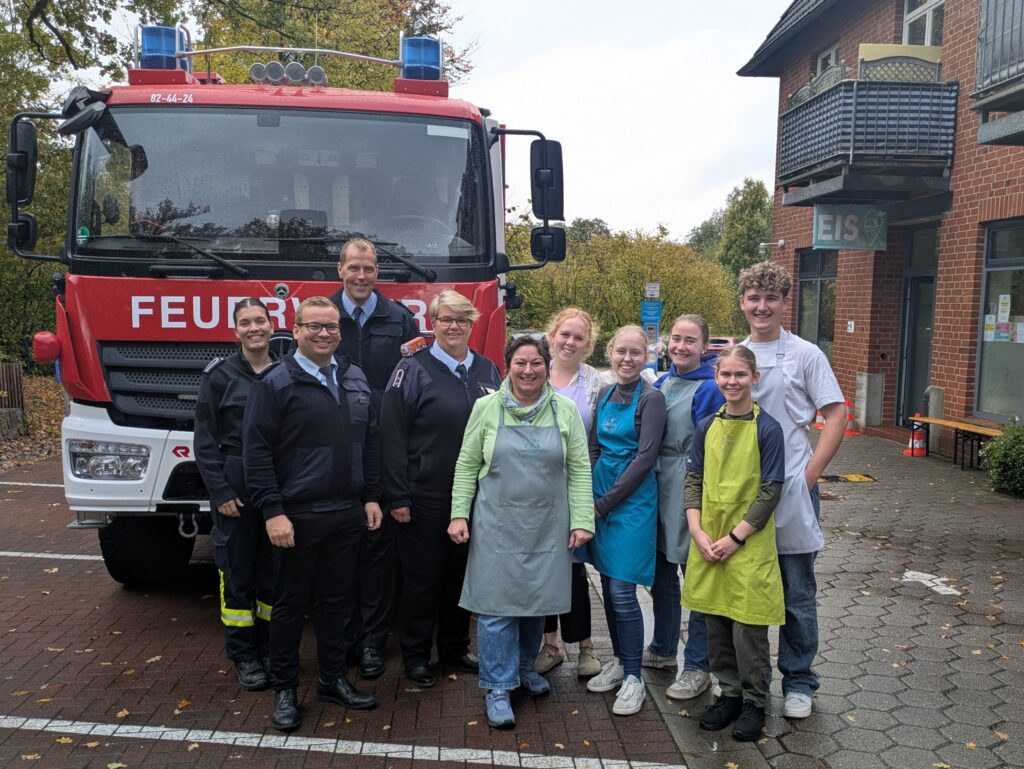 Nicole Heerßen und Stephan Westermann bedankten sich im Namen aller Jugendfeuerwehren bei Inhaberin und Helfern für die gelungene Aktion und die Spende! Die Spende wird für Aktivitäten der Samtgemeindejugendfeuerwehr verwendet.