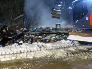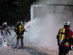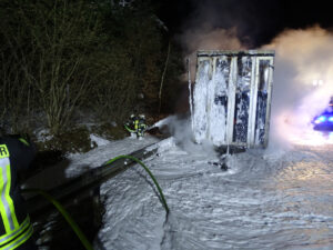 Nach Angaben des LKW-Fahrers bemerkte er einen Feuerschein an seinem Anhänger. Etwa 700 Meter vor der Rastanlage „Lüneburger-Heide-West“ brachte er sein Gespann auf dem Standstreifen zum Stehen. Das Feuer breitete sich schnell auf dem Anhänger aus. Geistesgewärtig koppelte der Fahrer seine Zugmaschine vom Anhänger ab. Beim Eintreffen der Feuerwehren an der Einsatzstelle stand der Anhänger bereits im Vollbrand. Unter Atemschutz gingen mehre Trupps vor. Mit Strahlrohren und einem Schaumrohr konnte der Brand schnell eingedämmt werden. Die Löschwasserversorgung wurde durch Tanklöschfahrzeuge sichergestellt. Die Ladung bestand augenscheinlich aus Textilien. Die weitere Brandbekämpfung der Ladung gestaltete sich aufwendiger. Um an die Brandnester in der Ladung zu kommen, wurden diese zunächst händisch auseinandergezogen und einzeln abgelöscht. Durch den Einsatzleiter, den Gemeindebrandmeister Bispingen, wurde ein Bagger eines privaten Unternehmens zu Einsatzstelle beordert. Der Bagger unterstützte beim Auseinanderziehen des Brandgutes, somit konnten letzte Glutnester gelöscht werden.