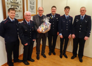Mitgebracht hatte Lütker zwei Ernennungen und eine Ehrung. Zum ersten Hauptfeuerwehrmann wurde Jörn Felix Bargmann und zum Feuerwehrmann Lennard Rose ernannt. Für die 60-jährige Mitgliedschaft in der Feuerwehr wurde Gerhard Heuer geehrt. Als Dank für die lange Treue zur Wehr erhielt Heuer aus den Händen des stellvertretenden Samtgemeindebürgermeisters Rühe einen Präsentkorb überreicht.