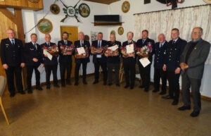 Besonders erfreut sei er darüber zahlreiche Ehrungen für die langjährigen Mitgliedschaften in der Wehr aussprechen zu dürfen. Für die 25-jährige Mitgliedschaft wurde Andreas Kraft und für die 40-jährige Mitgliedschaft wurden Helmut Röhrs sowie Ulf Cordes geehrt. Zahlreiche Ehrungen gab es für die stattliche 50 Jahre Mitgliedschaft in der Feuerwehr. Für die lange Zugehörigkeit wurden geehrt: Ralf Schill, Hinrich Schröder, Werner Rademacher und Manfred Kröger sowie Manfred Albers.