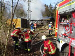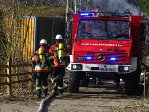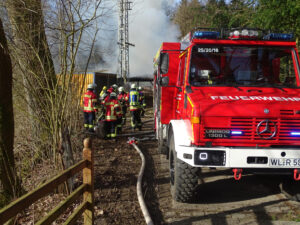 (jma) Wesel. Am Freitag gegen 08:30 Uhr wurden die Feuerwehren aus Wesel, Undeloh und Hanstedt zu einem Schuppenbrand nach Wesel in den Ortsteil Meningen alarmiert. Aus bisher unbekannter Ursache war ein 10 x 20 Meter großer Schuppen in Brand geraten. Beim Eintreffen der Feuerwehren stand das Holzgebäude bereits im Vollbrand. Die Dacheindeckung bestand aus Faserzementplatten. Die Faserzementplatten enthielten vermutlich Asbestfasern, dies stellte für die Einsatzkräfte eine besondere Gefährdung da. Bis auf Hausrat stand der Schuppen weitgehend leer. Mit 4 C-Strahlrohren und eingesetztem Netzmittel konnte der Brand schnell unter Kontrolle gebracht werden. Die Wasserversorgung wurde durch die Tanklöschfahrzeuge und Hydranten sichergestellt. Zur weiteren Löschwasserversorgung wurde das Tanklöschfahrzeug der Feuerwehr Holm nachgeordert. Die Nachlöscharbeiten zogen sich rund 2 Stunden hin. Etwa 53 Einsatzkräfte, darunter 13 Kräfte unter schweren Atemschutz, waren im Einsatz. Umfangreiche Hygienemaßnahmen folgten, um Gesundheitsgefahren für die Kräfte durch die eventuellen Asbestfasern und sonstigen Schadstoffen auszuschließen. Die eingesetzten Geräte, Einsatzkleidung und die Schläuche wurden einer fachgerechten Reinigung zugeführt. Hierzu wurde der Wechsellader (Abrollbehälter Schläuche) der Feuerwehrtechnischen Zentrale Hittfeld angefordert. Die Polizei Salzhausen ermittelt die Ursache und die Schadenshöhe.