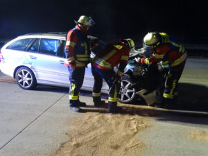 (jma) Evendorf. Am Samstag gegen 05:40 Uhr wurden die Feuerwehren Egestorf und Sahrendorf/Schätzendorf zu einem Verkehrsunfall, mit eingeklemmter Person, auf die Autobahn A7 alarmiert. Zwischen den Anschlussstellen Evendorf und Bispingen, in Fahrtrichtung Hannover, war ein Mercedes aus ungeklärter Ursache auf den Sattelauflieger eines LKW aufgefahren. Beim Eintreffen der Feuerwehr war der 32-jährige Fahrer des Mercedes von Ersthelfern bereits aus dem Fahrzeug befreit worden. Die Feuerwehrkräfte sicherten die Unfallstelle ab, stellten den Brandschutz sicher und klemmten die Batterie am Unfallfahrzeug ab. Auslaufende Betriebsstoffe wurden mit einem Bindemittel aufgefangen. Der 45-jährige LKW-Fahrer blieb unverletzt. Zu den Verletzungen des PKW-Fahrers kann die Feuerwehr keine Angaben machen. Die Autobahnpolizei aus dem Heidekreis ermittelt die Unfallursache und die Schadenshöhe.