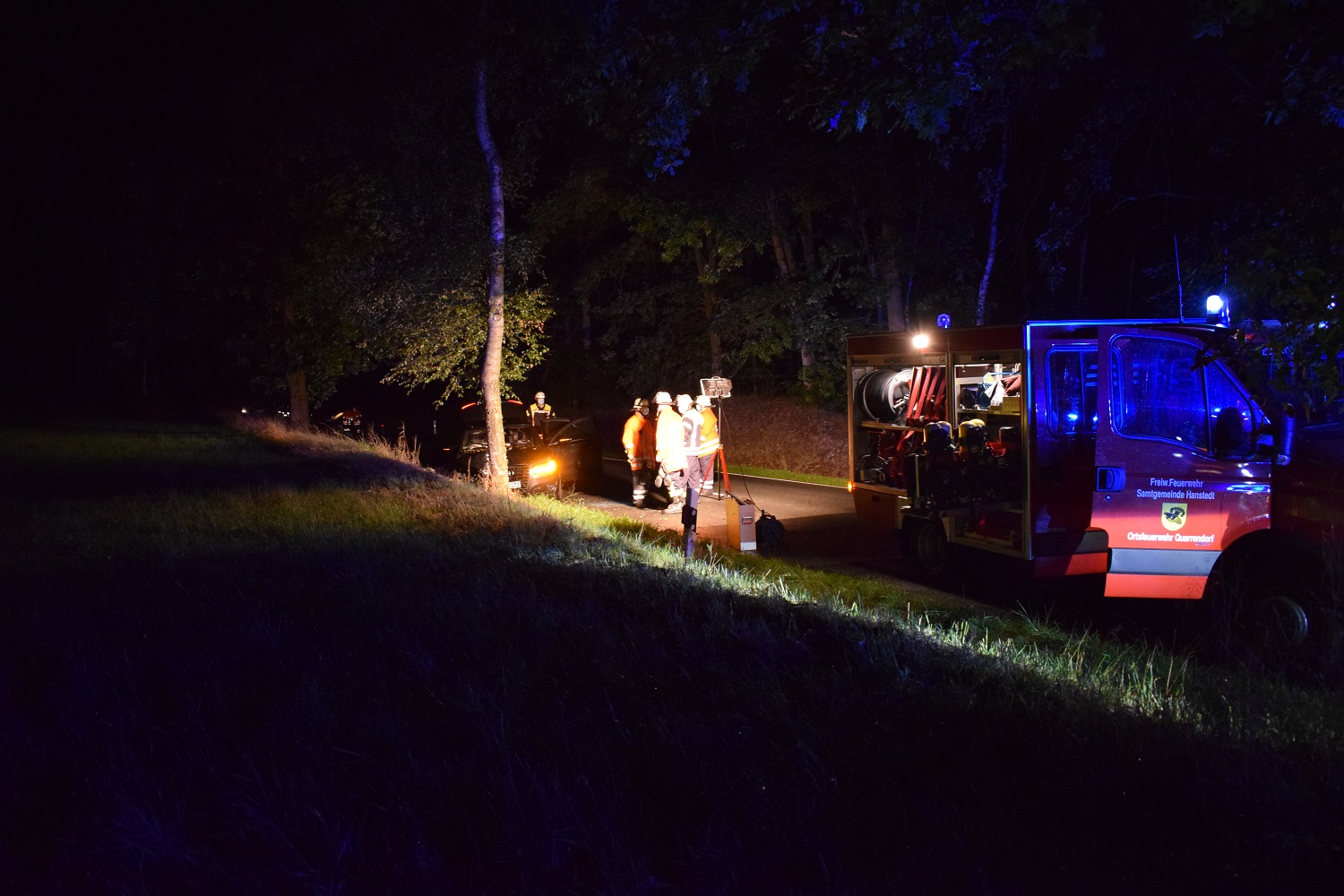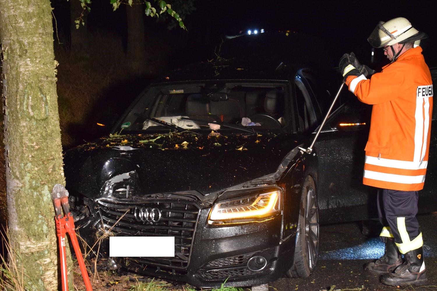 (fba) Quarrendorf. Bei einem Verkehrsunfall zwischen Quarrendorf und Brackel wurde am Mittwochabend ein 34-jähriger Hanstedter verletzt. Der Mann befuhr gegen 20:30 Uhr die L215 von Quarrendorf kommend in Richtung Brackel. Zwischen den Ortschaften kam er dabei, aus bisher ungeklärter Ursache, mit seinem Audi A8 nach rechts von der Fahrbahn ab und kollidierte frontal mit einem Baum am Straßenrand. Zufällig am Einsatzort vorbeikommende Ersthelfer konnten dem Mann aus seinem Fahrzeug helfen und ihn betreuen. Da zunächst Rauch aus dem Fahrzeug aufstieg, wurde, neben dem Rettungsdienst und der Polizei, die Freiwillige Feuerwehr Quarrendorf zur Einsatzstelle alarmiert. Glücklicherweise bestätigte sich die Rauchentwicklung vor Ort nicht, sodass sich die Arbeit der Feuerwehr auf das Betreuen des Verunfallten, das Ausleuchten der Einsatzstelle, das Abklemmen der Fahrzeugbatterie sowie das Abstreuen von ausgelaufenen Betriebsstoffen beschränkte. Der Verletzte wurde an den Rettungsdienst übergeben und zur weiteren Versorgung in ein Krankenhaus verbracht. Über Schadenshöhe und Unfallursache kann keine Angabe gemacht werden.