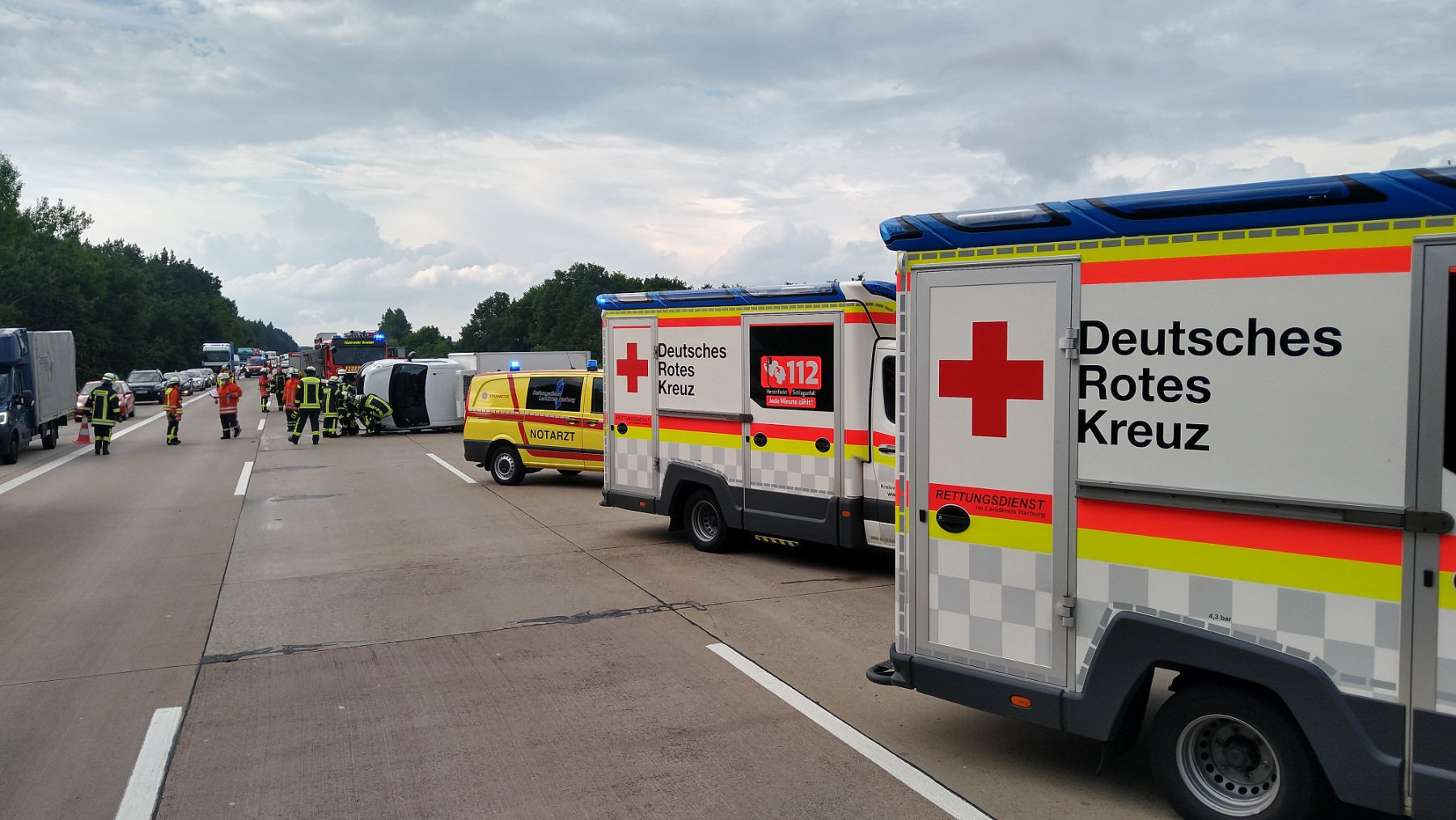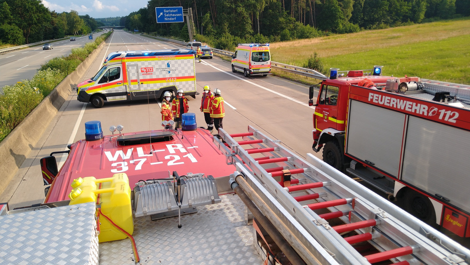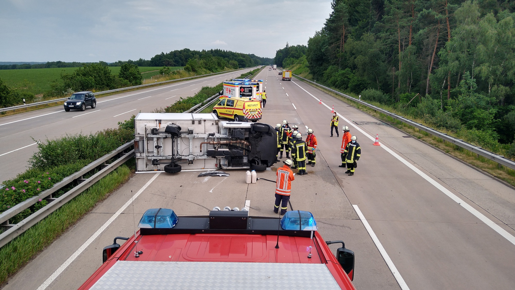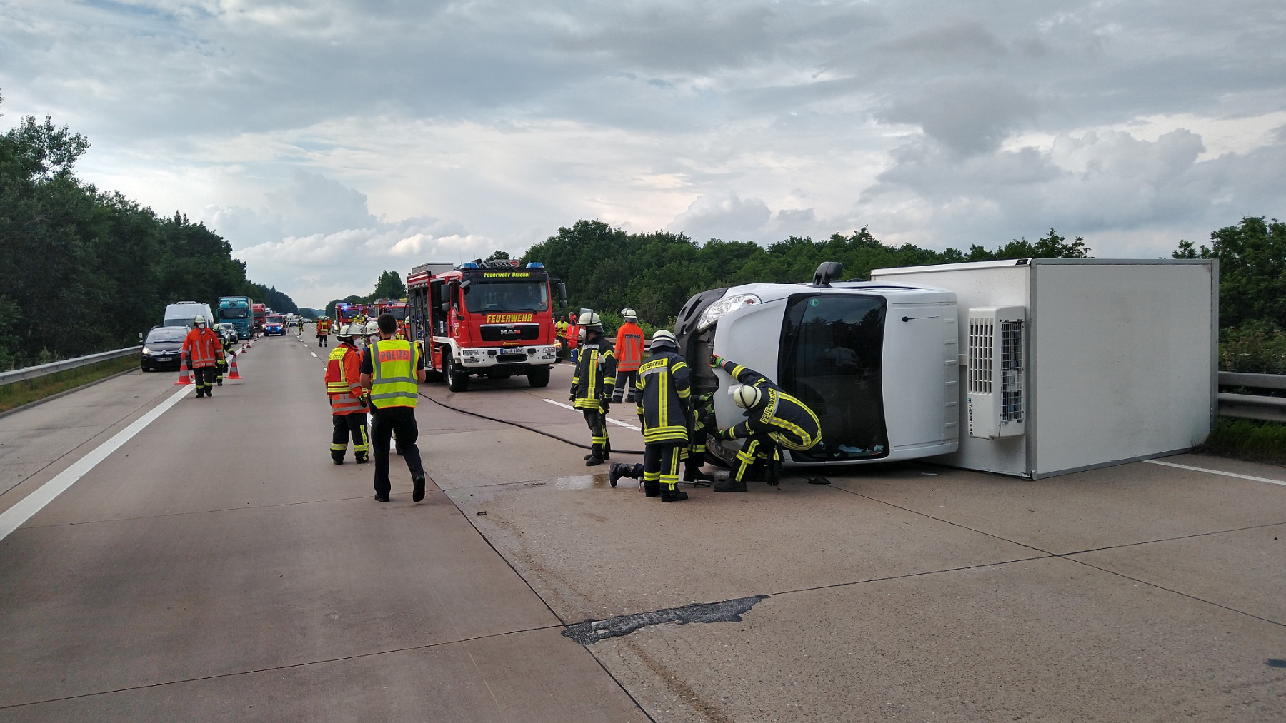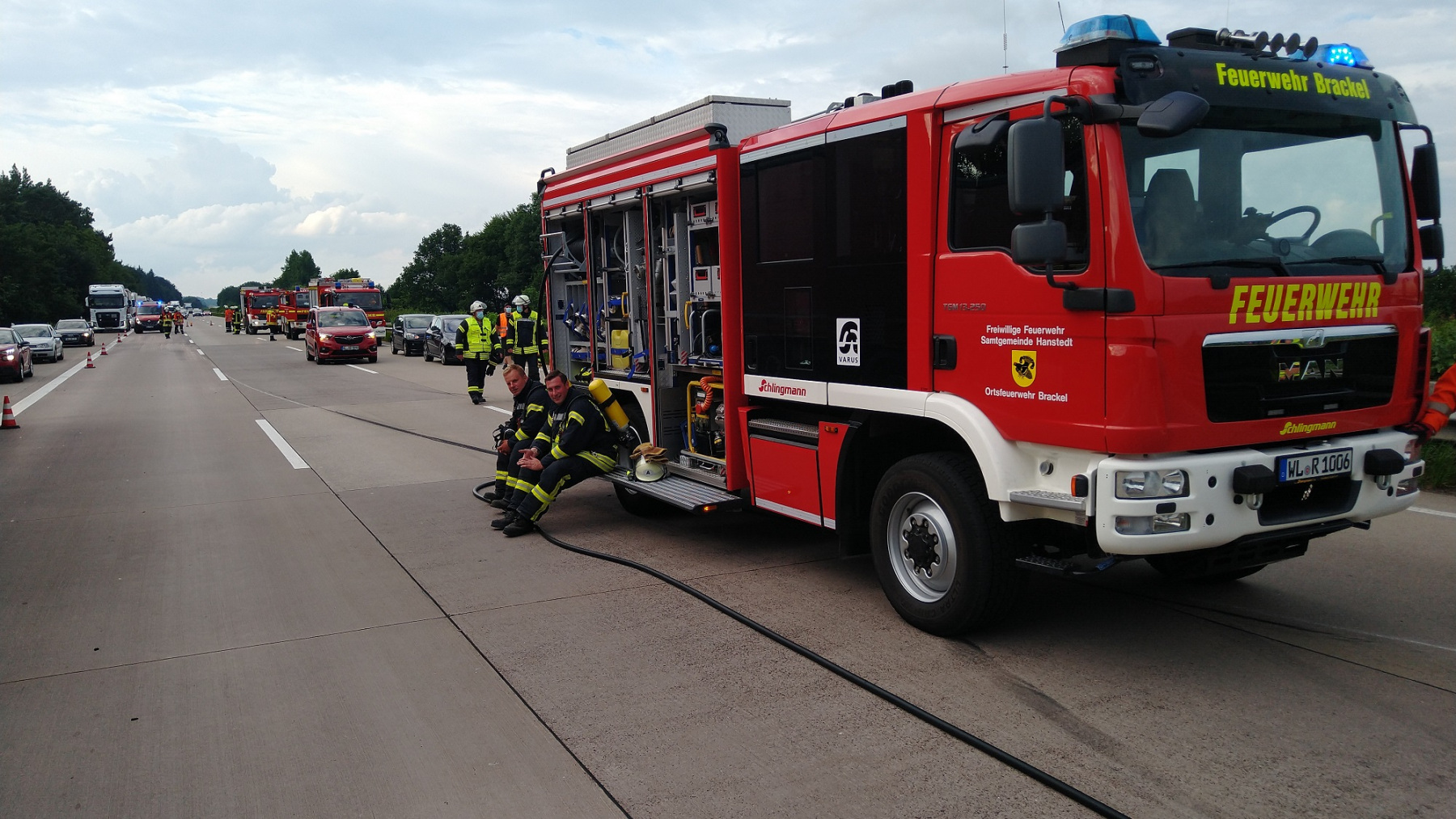 (fba) Brackel. Gegen 18:45 Uhr, und damit während des laufenden EM-Spiels England vs. Deutschland, befuhr der Fahrer eines Renault Master die BAB 7 in Fahrtrichtung Hannover. Zwischen den Anschlussstellen Thieshope und Garlstorf platzte ein Reifen an seinem Fahrzeug, woraufhin der Fahrer die Kontrolle über sein Fahrzeug verlor. Dieses schleuderte über die Autobahn und blieb schließlich auf die Seite gekippt auf dem linken Fahrstreifen liegen. Da zunächst von einem eingeklemmten Fahrer ausgegangen wurde, alarmierte die Leitstelle, neben dem Rettungsdienst und der Polizei, die Freiwilligen Feuerwehren aus Brackel und Ohlendorf sowie den Rüstwagen der FF Maschen zur Einsatzstelle. Weiterhin rückte der Einsatzleitwagen der Samtgemeindefeuerwehr aus. Da der Fahrer sich selbst aus seinem Fahrzeug befreien konnte, konnten die Einsatzkräfte der FF Maschen sowie die Besatzung des Einsatzleitwagens noch auf der Anfahrt beidrehen. Die Feuerwehrkräfte aus Brackel und Ohlendorf betreuten den Verletzten, streuten auslaufende Betriebsstoffe ab und stellten den Brandschutz sicher.