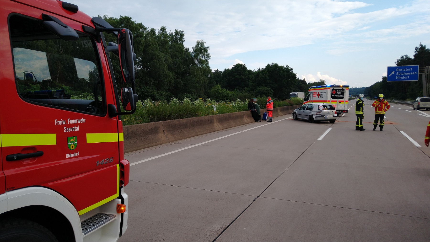 Noch während des laufenden Einsatzes an der Unfallstelle ereignete sich einige Kilometer weiter, kurz vor der Anschlussstelle Garlstorf, ein weiterer Unfall. Ein mit drei Personen besetzter VW Golf kam aus ungeklärter Ursache ins Schleudern, touchierte die rechte Leitplanke und blieb schließlich auf dem linken Fahrstreifen liegen. Die Feuerwehrkräfte der FF Ohlendorf, die sich zu diesem Zeitpunkt auf der Heimfahrt vom ersten Einsatz befanden, fuhren kurz hinter dem verunfallten Fahrzeug und konnten entsprechend sofort Erste Hilfe leisten und die Unfallstelle absichern. Alle drei Unfallbeteiligten, darunter eine hochschwangere Frau, wurden zunächst von der Feuerwehr und anschließend vom Rettungsdienst versorgt und in umliegende Krankenhäuser verbracht. Auch an dieser zweiten Unfallstelle stellte die Feuerwehr den Brandschutz sicher und streute auslaufende Betriebsstoffe ab.